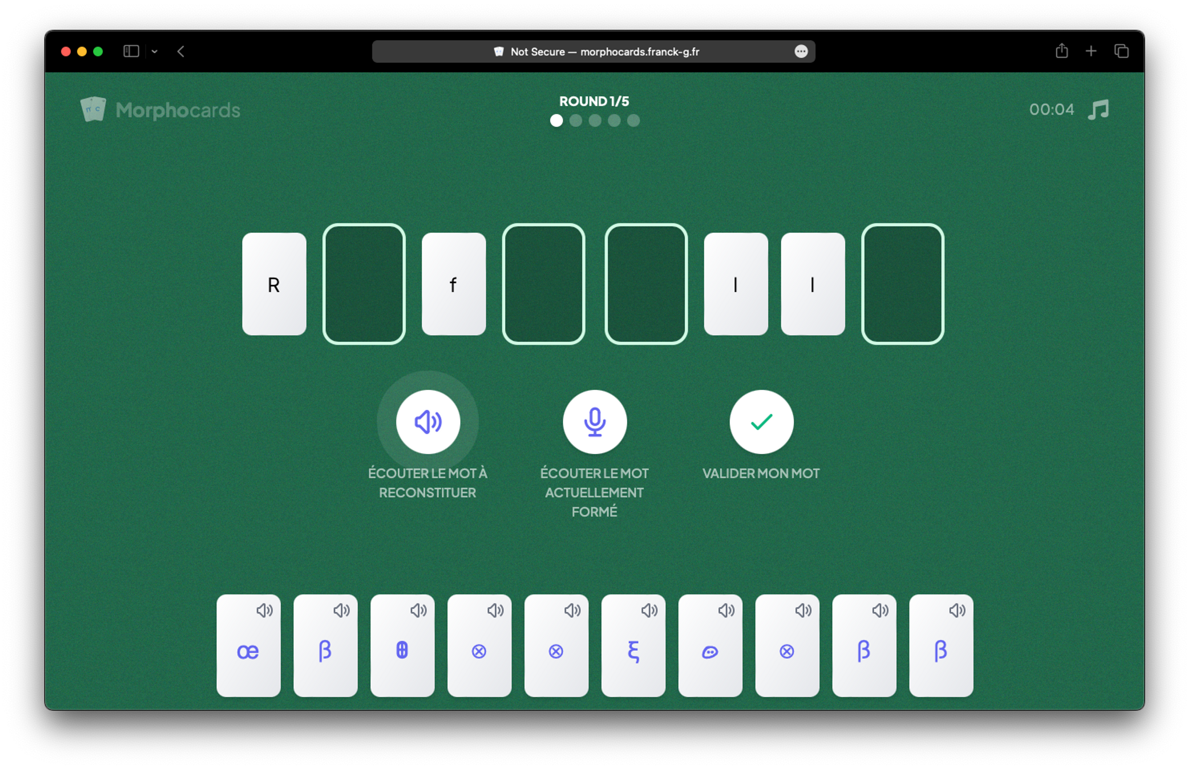 During each round, the player hears the word to be completed, and can listen to it again and again. The player's aim is to reconstruct the word heard, using the cards in his or her hand.